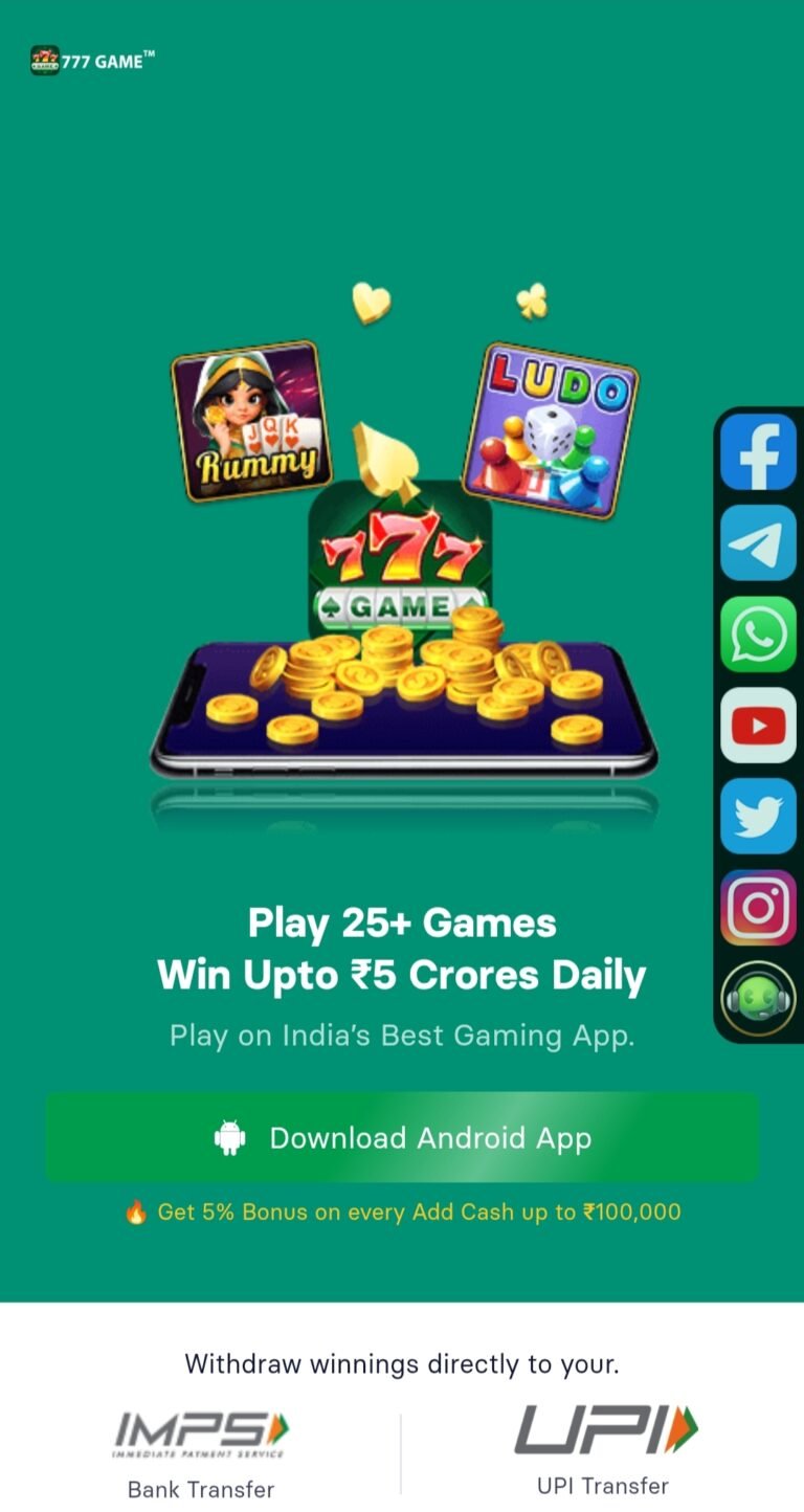 Welcome To 777 GAME  Yono App Download Fast New Yono Lunch Bonus ₹55-555 free 777 GAME Yono Online Earning Platform 777 GAME I also Game Play Ludo, poker, teen patti, Slots Game, Mini-Games, Make Colour Predictions & Participate In Quizzes And Other skills Games 777 GAME withdrawal Amount 100 Rupees Best India Game Platform Trusted By 1 Crore Player With 4.1 Ranking.
